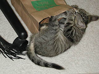 Found this tiny kitten in a parking lot on 9/29/2000. Felt I couldn't just leave him there (the potential for him getting run over and killed seemed high), so I brought him home with me. My allergies weren't very happy with the arrangement though, and plus he was just too much energy (and distraction) for me in my life at the time, so I asked around and found an excellent new home for him. Tim (a friend of a friend) had an adult cat already, and offered to take this feller.Of course, before Tim volunteered to take this guy, I was considering taking him to an adoption center (Second Chance Pets here in Houston). It's a sad fact of life that people are lazy about spaying/neutering their pets, and as a result, there are lots of unwanted pets sent to shelters (or worse, doomed to live short lives outdoors, before they get attacked by some other animal, or hit by a car or whatever). So please, if you have a pet, do the humane (and responsible) thing and get your pet fixed.