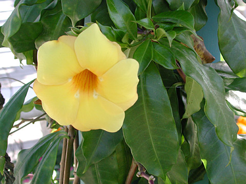 Lovely *big* yellow flower. Trumpet-shaped, though you can't really tell from this angle. I'd originally thought it was a mandevilla, but my friend Barry tells me its an Allamanda. << Previous | Index | Next >>